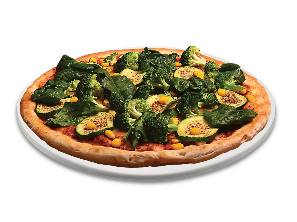 Frischer Teig, Tomatensauce, echter Käse, Zucchini, Broccoli, Spinat, Mais